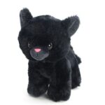 Álló, 20 cm-es fekete plüss cica, rózsaszín orral, műanyag szemekkel.