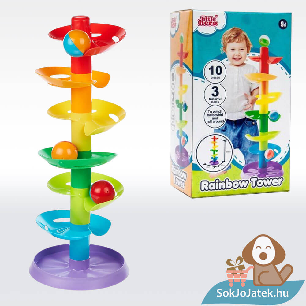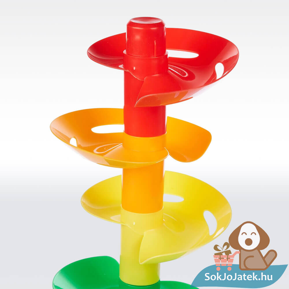 A bébi golyópálya egy izgalmas és látványos készségfejlesztő bébijáték, amely tökéletesen leköti a babák figyelmét, miközben játékosan fejleszti képességeiket. A 10 darabos készlet elemei könnyedén egymásra helyezhetők, így egy stabil, 51 cm magas golyópályát építhettek belőlük. A tálcák lejtős kialakítása lehetővé teszi, hogy a csörgő golyók körbe-körbe guruljanak lefelé, egészen az alsó szintig.