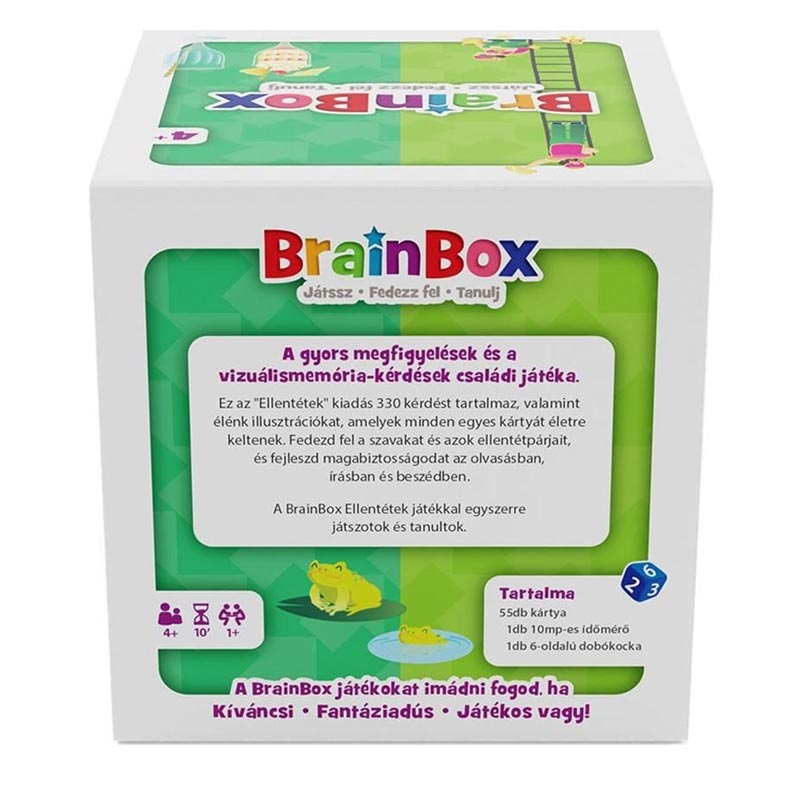 Meg tudsz jegyezni 10 másodperc alatt minél több ellentétet? A BrainBox – Ellentétek társasjáték a megfigyelés játéka, ahol nagy szerepet kap a memória is. A játékosoknak 10 perc alatt kell minél több pontot szerezniük, ehhez 10 másodpercig kell figyelni egy kártyát, majd a dobókockával dobott számú kérdésre kell helyesen válaszolni, emlékezetből.