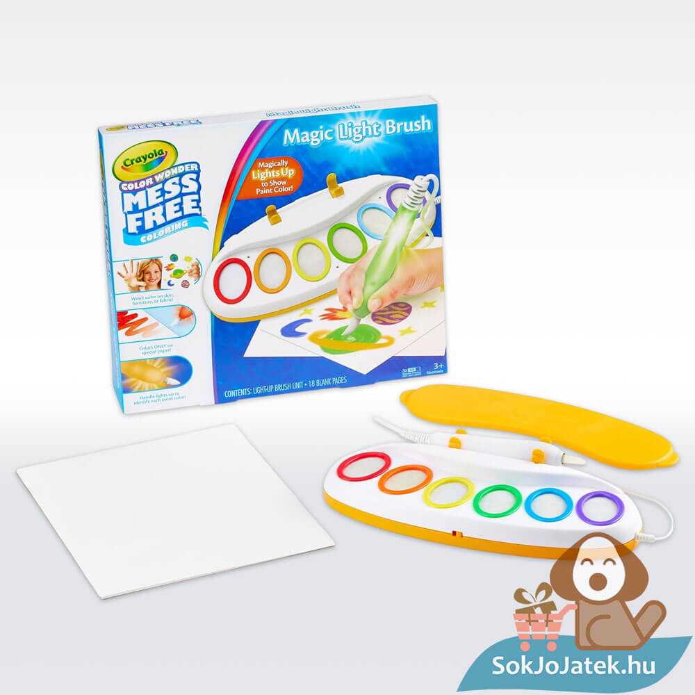 A Crayola Color Wonder varázs festőkészlet világító ecsettel izgalmas élményt nyújt a gyerekeknek, hiszen a színek csak a speciális Color Wonder papíron jelennek meg, így nincs többé firka a bútoron vagy a ruhán. A különleges ecset háromféle színben világít, mindig annak megfelelően, amit éppen használ, ezzel még varázslatosabbá teszi az alkotást.