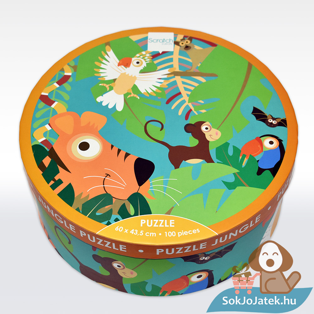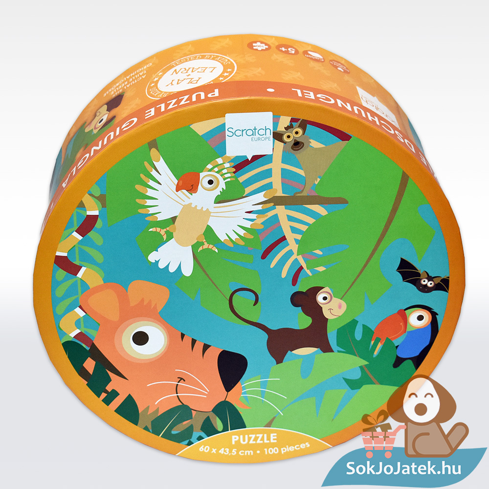 100 db-os Scratch Europe puzzle, mely a dzsungel állatait eleveníti meg egy kedvesen illusztrált képen.