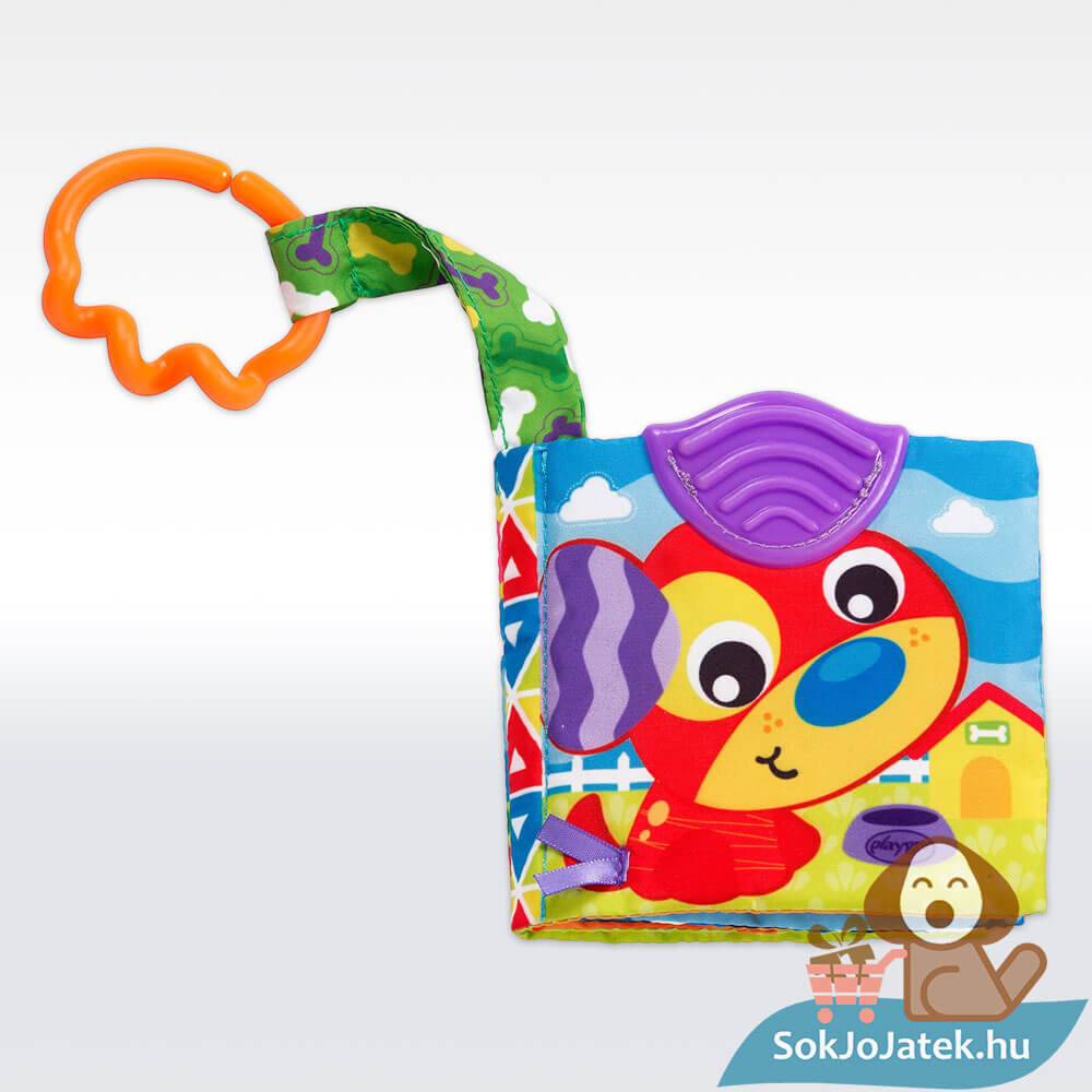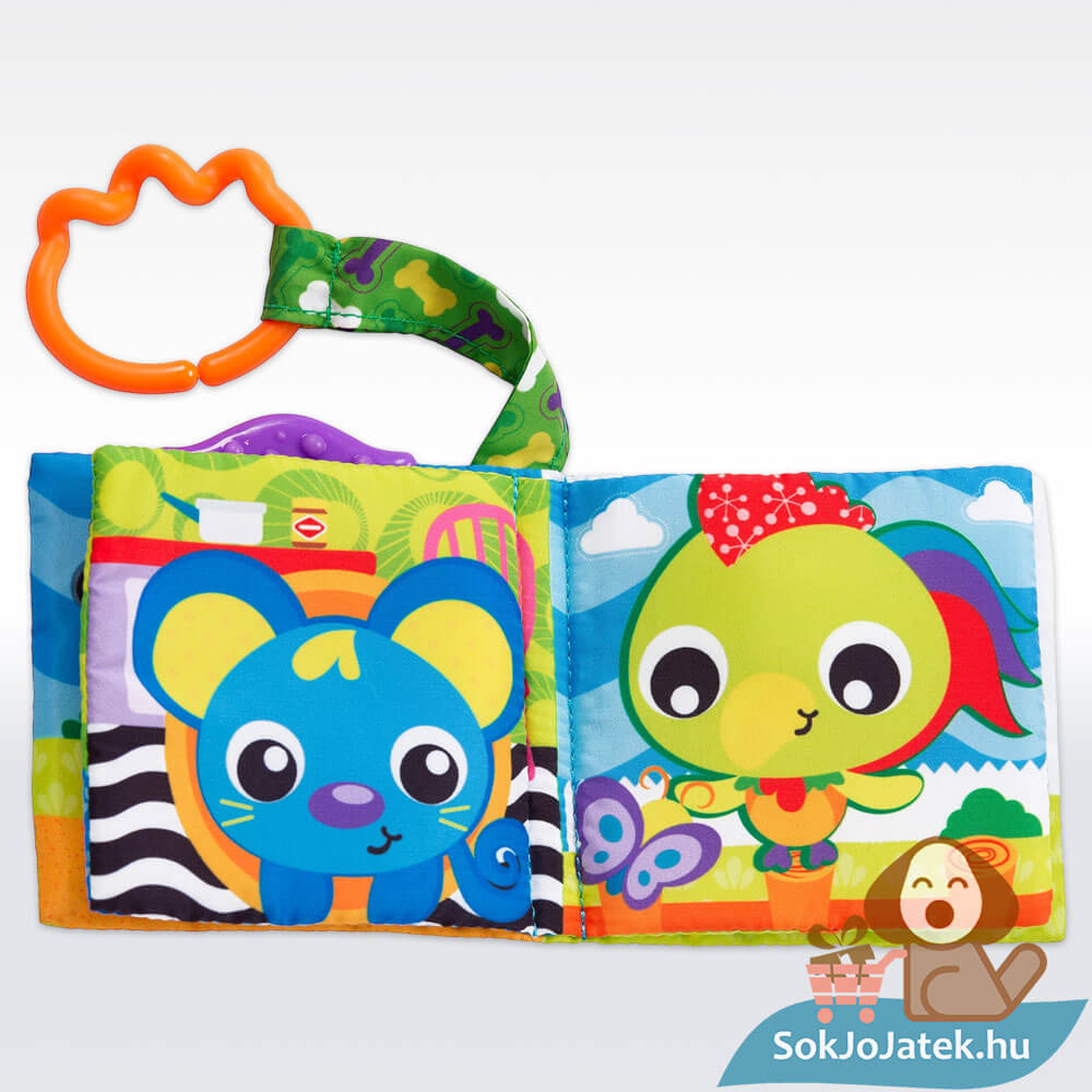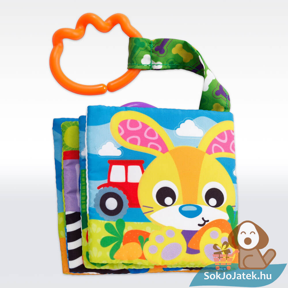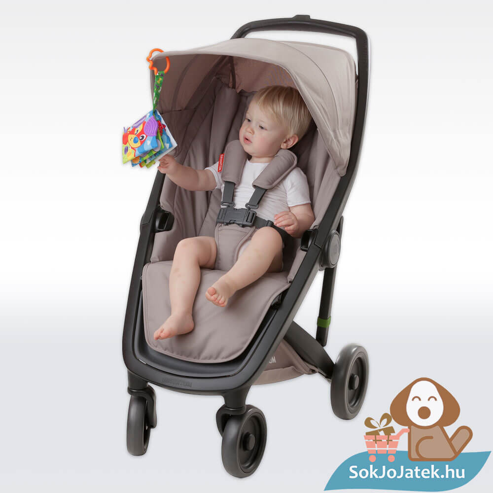 Az első oldal zörgőpapírral készült, hogy hangos visszacsatolással ösztönözze a baba figyelmét és mozgását, egy másik lap pedig sípoló puha golyót rejt, ami meglepetésszerű élményt nyújt. A könyvecske tetején egy praktikus rágóka is található, amely enyhíti a fogzás okozta kellemetlenségeket. A hozzáerősített akasztóval könnyen rögzíthető a kiságyhoz, autósüléshez vagy babakocsihoz, így mindig kéznél lesz.