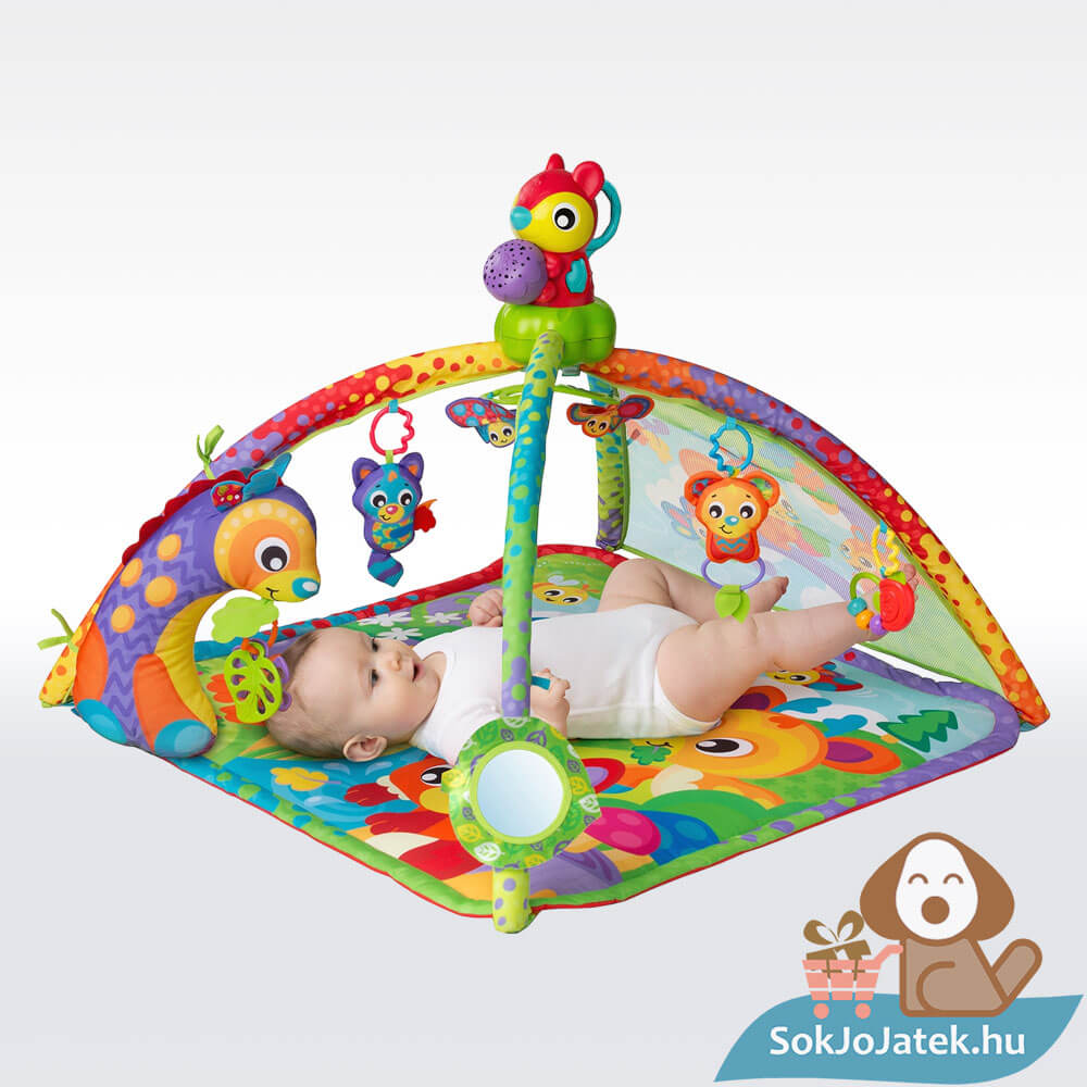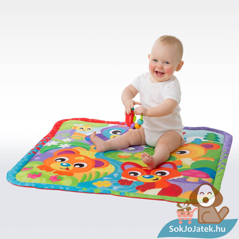 Az erdős játszószőnyeg teljesen átmozgatja a babát, miközben megismerteti az állatokkal is! A szőnyeg puha plüssből készült. Az állatok más-más tapintásúak, és a baba amint felfedezi őket, rögtön nyújtózkodni kezd, hogy elérje őket. A bébi játszószőnyeg erősíti a pici izomzatát, és fejleszti a mozgáskészségeket, a tapintást is.