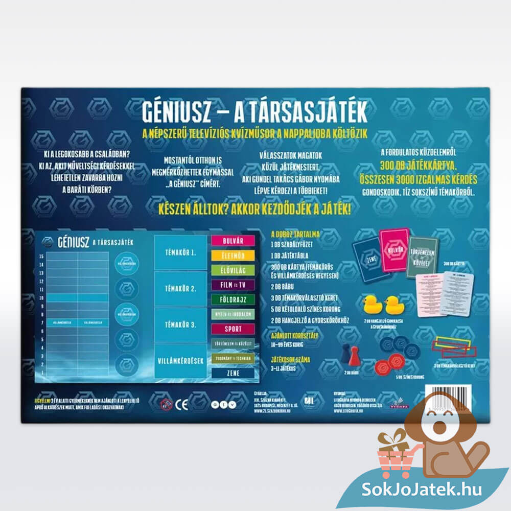Most te is kipróbálhatod magad a népszerű televíziós kvízműsor hangulatában a Géniusz társasjátékkal! Mérd össze tudásodat barátaiddal vagy családoddal, és derítsétek ki, ki a legműveltebb a társaságban. A játékban egy valódi vetélkedő részese lehetsz, ahol a gyorsaság, a logika és a tudás egyaránt számít.
