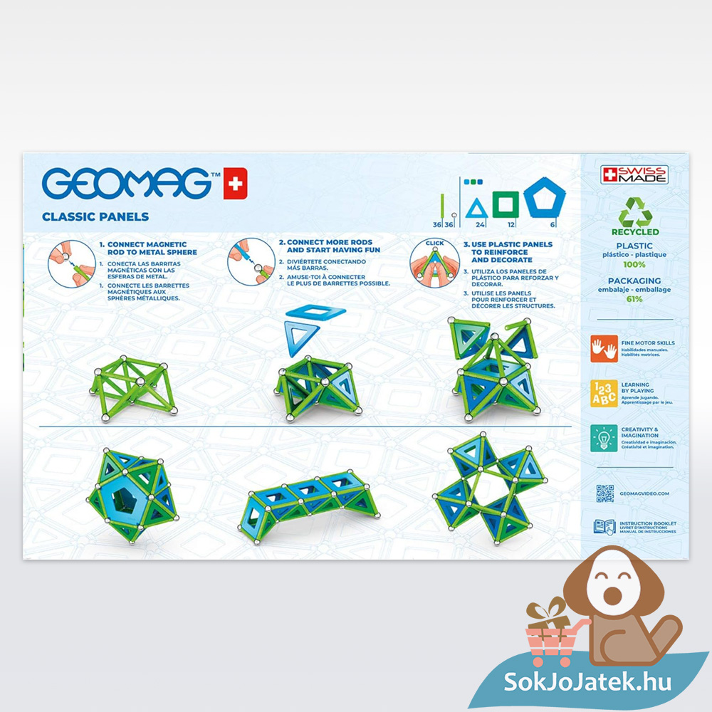 A Geomag Classic Panel tartalmazza az összesen 114 darab elemet, különböző formákban.