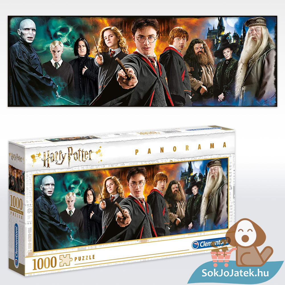 Merülj el a varázsvilágban a Harry Potter panoráma puzzle segítségével, amely a Clementoni gyártó 1000 darabos kirakója. Ez a prémium minőségű Harry Potter puzzle egy igazán lenyűgöző, 98 x 33 cm-es képpé áll össze, ahol a történet legismertebb karakterei elevenednek meg, Harry, Hermione, Ron, Dumbledore, Hagrid, Piton professzor, Draco Malfoy és persze Voldemort is feltűnik.