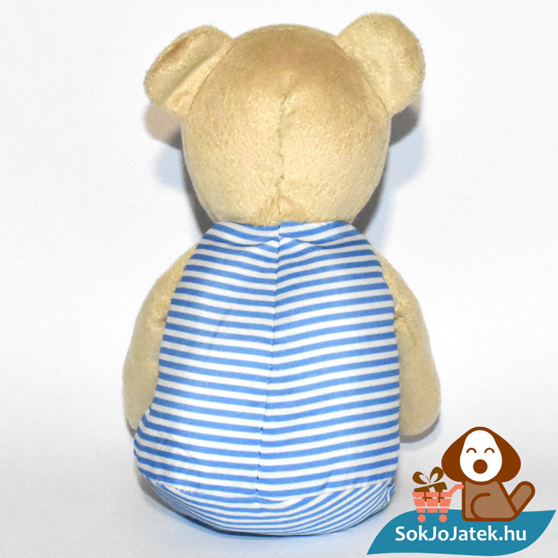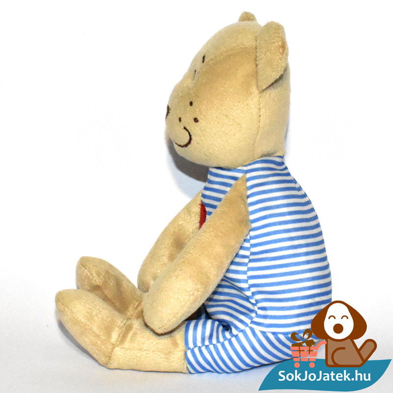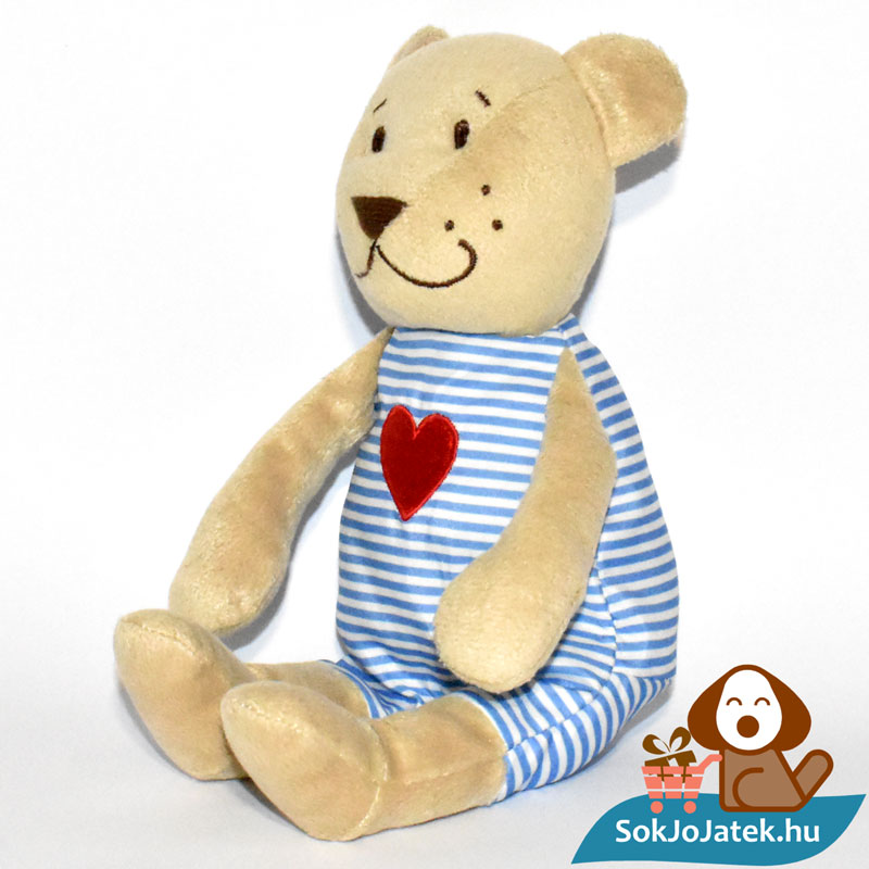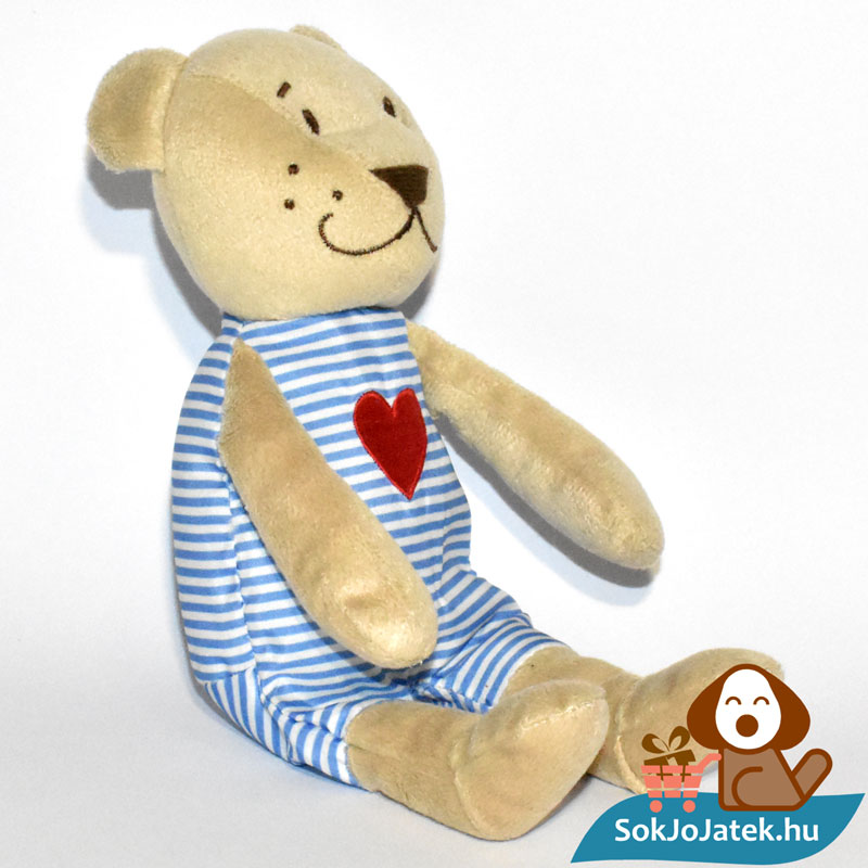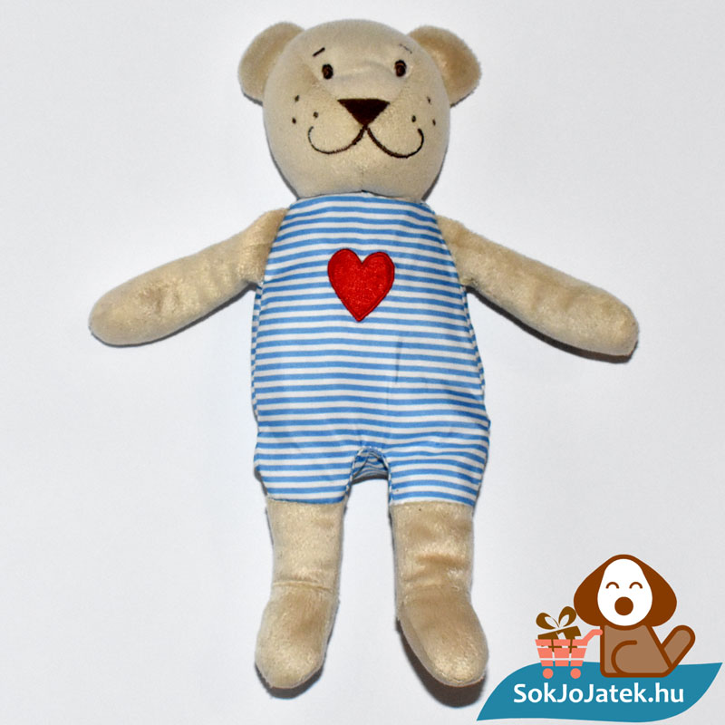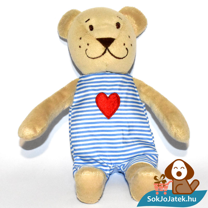 A plüssfigura bézs, barna színű, ruhája fehér-kék csíkos, mellkasán nagy, hímzett piros szívvel. Lábain önállóan nem képes megállni. Mosógépben alacsony hőfokon kimosható. Méretéből adódóan kiválóan alkalmas hurcolni, ölelgetni, akár utazáshoz is kis helyen elfér, így kiváló társ lehet a mindennapokban. Éppen ezért is érdemes több darabot venned belőle – amíg a készletünk tart.