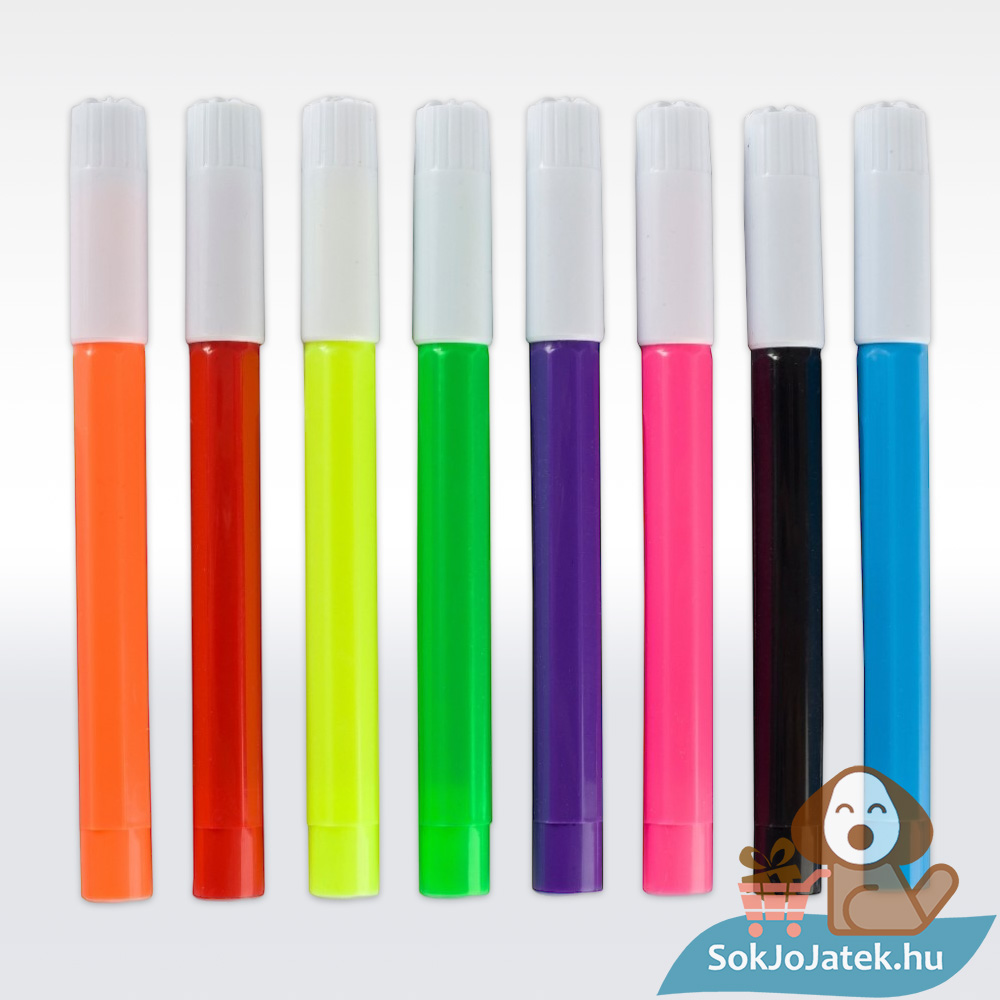 A dobozban kék, fekete, lila, rózsaszín, zöld, sárga, piros és narancssárga színű filctollak találhatók.