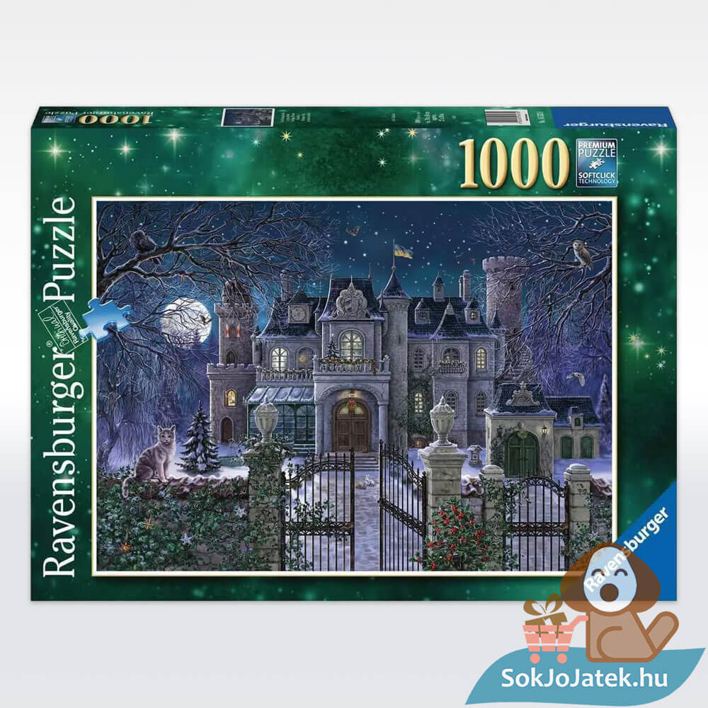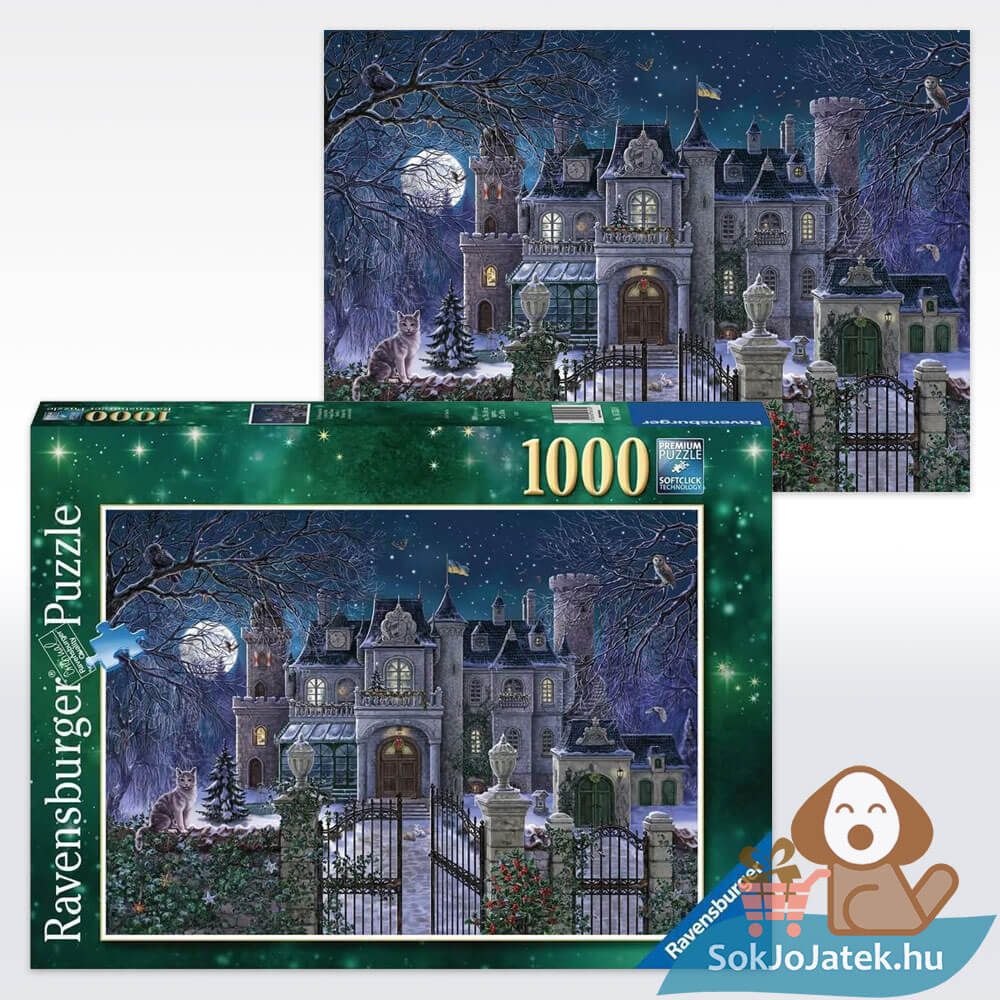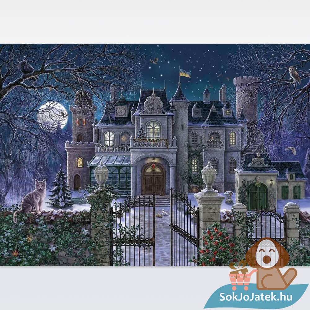 A képen egy impozáns kastély emelkedik ki a téli tájból, amelyet sötét, csillagfényes égbolt és kopasz fák vesznek körül. A havas kertben egy kőből készült díszes kapu, szobrok és bokrok varázsolják el a nézőt, miközben egy szürke csíkos cica ül a kerítésen, figyelve a titokzatos éjszakát. A háttérben a telihold világítja meg a kastélyt, ami különleges karácsonyi puzzle atmoszférát teremt, és életre kelti az álomszerű tájat.
