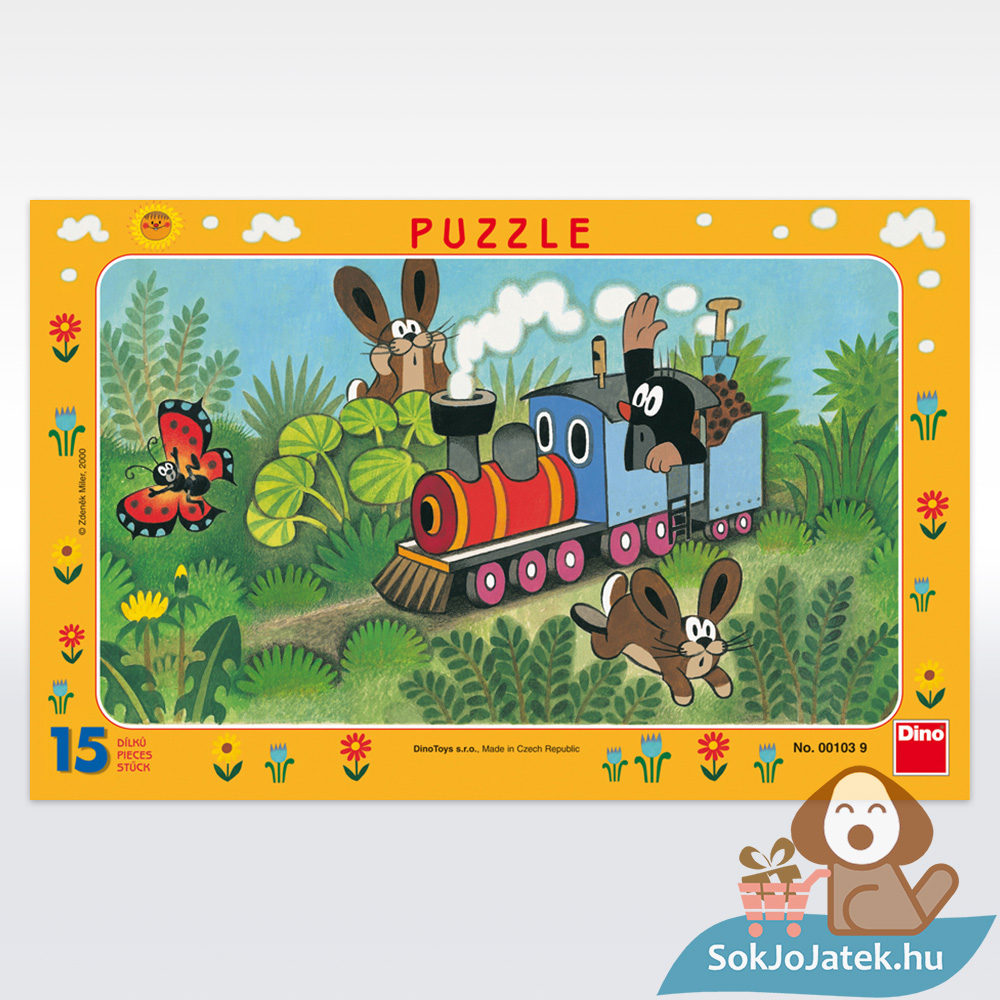 A Kisvakond már egy mozdonyt is el tud vezetni, a nyuszik legnagyobb riadalmára! A Kisvakond és a mozdony 15 darabos puzzle kisebb gyerekek számára készült, keretes kirakós játék. A nagyobb puzzle-darabokat a keretbe kell beilleszteni, és miközben előtűnik a Kisvakond, a picinek a megfigyelése és a kézügyessége is fejlődik. Kirakott méretek: 29 x 19 cm.