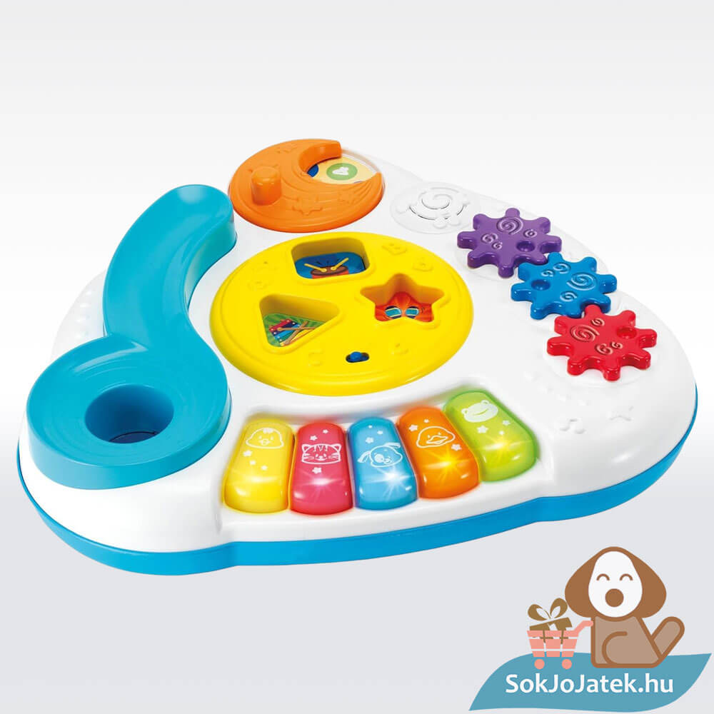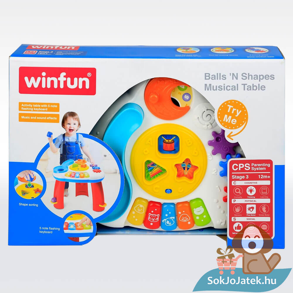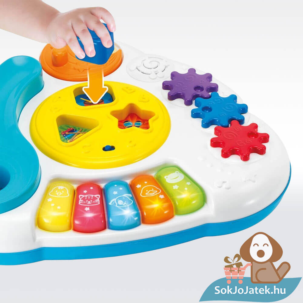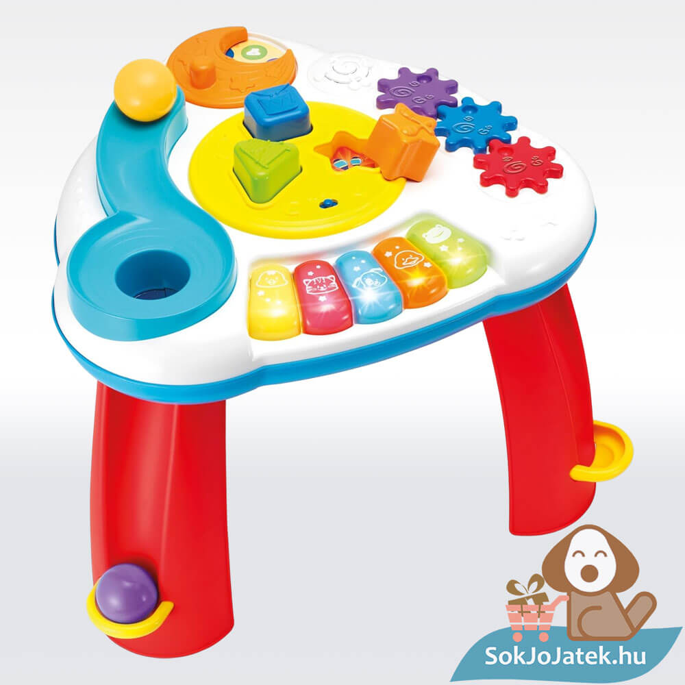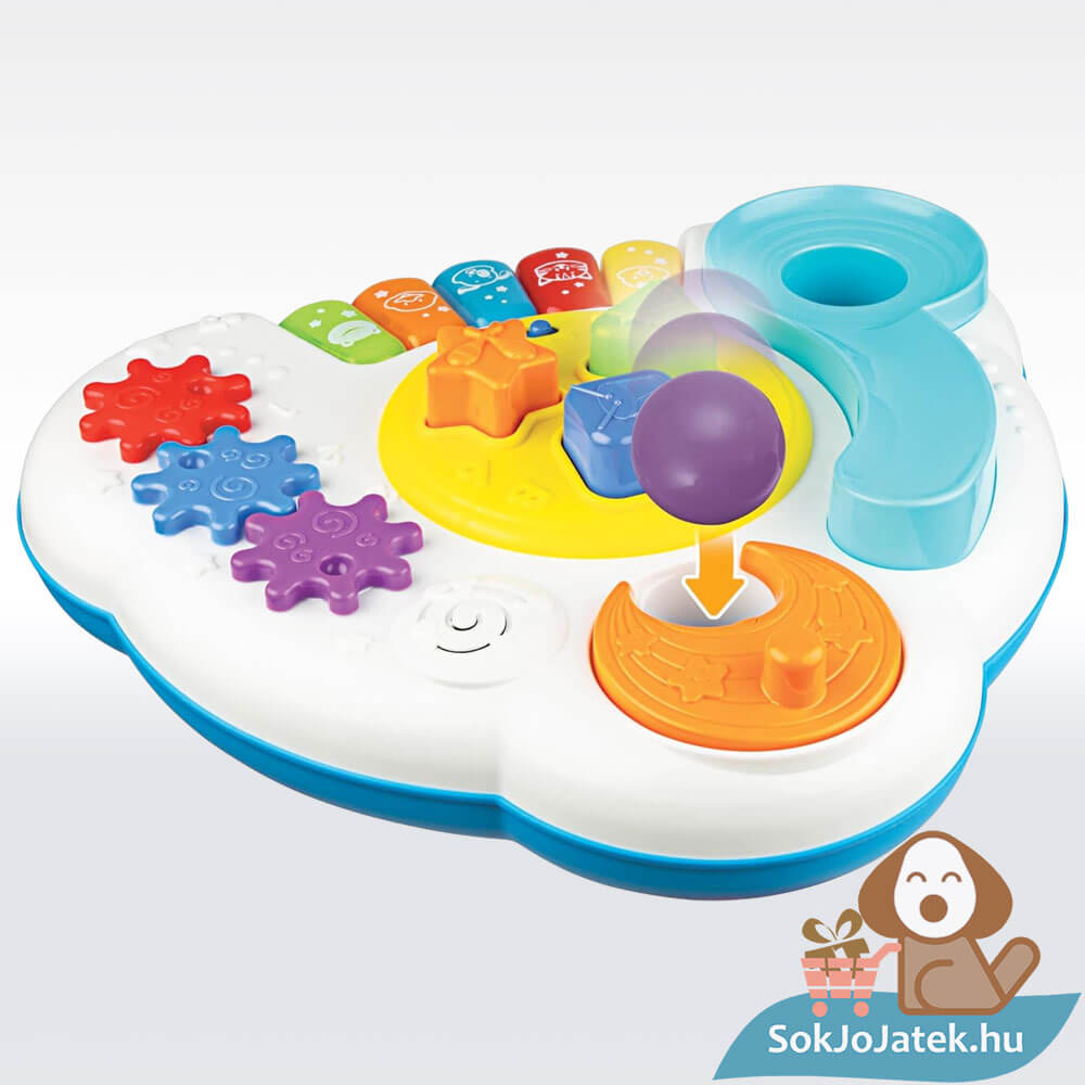 Színes, rengeteg kalandot rejtő bébi játszóasztal! A Labdák és formák zenélő bébiasztal egy készségfejlesztő, műanyagból készült asztal, ami együtt nő a babával. Az asztal lábai levehetők, hogy a földön is tudjon vele játszani a pici, a zongora billentyűi vidám hangokat, dallamokat játszanak le a gyereknek. Az asztalon lévő színes lyukakba a labdákat tudja benyomni a pici, a Labdák és formák zenélő bébiasztal egy golyócsúszdával is fel van szerelve. A Labdák és formák zenélő bébiasztal fejleszti az érzékelést, a mozgékonyságot és a kézügyességet is, a vidám dallamok pedig szórakoztatóan és nyugtatóan hatnak. A játék 3 darab AA ceruzaelemmel működik, a csomagolás az elemeket tartalmazza.
