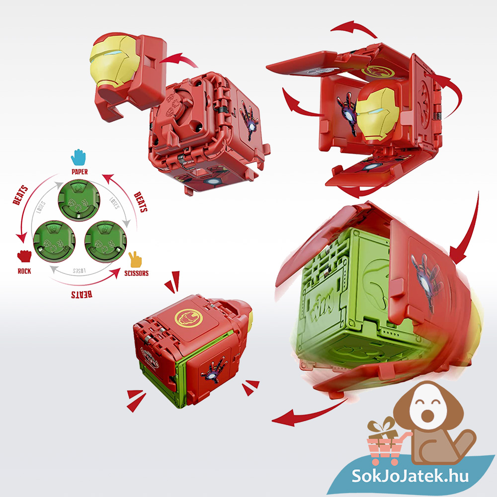 A Marvel kocka csata a kő, papír és olló stratégiára épül. Nyisd ki az általad választott kockát, válaszd ki a titkos támadási stratégiád (kő, papír vagy olló) majd állítsd Marvel hősödet HARC MÓDBA és csúsztasd az asztalon az ellenfeled felé. A játékban olyan speciális mágnest helyeztek el, hogy a kő, papír vagy ollót felismeri és amelyik üti a másikat, a Marvel kocka csapdába esik. Aki a csatában nyert, az kapja a tokent és aki a legtöbb tokent tudta összegyűjteni, az nyeri a Marvel Bosszúállók csatáját.