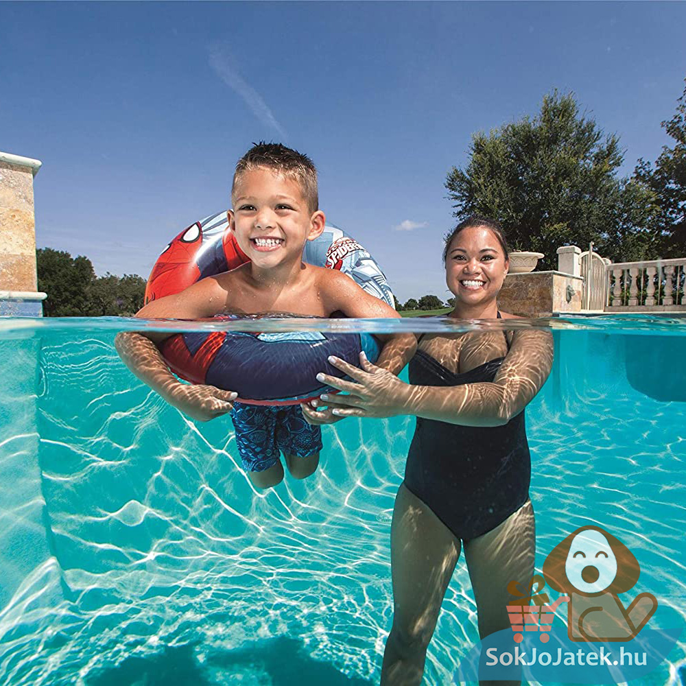 Pókemberes úszógumi a Marvel univerzumból, melynek felfújt mérete 56 centiméter. A Bestway márkájú úszógumin a piros ruhás Pókember látható, melyet minden szuperhősért rajongó gyermek imádni fog a vízben használni.