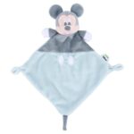 A kendő finom tapintású, világoskék és sötétszürke színekből áll, sarkain kis csomók találhatók, amelyek játékra ösztönzik a babákat és fejlesztik a tapintásérzéket. A Mickey egér figura szelíd arckifejezése és ölelhető formája megnyugtató jelenlétet biztosít a kicsik számára.