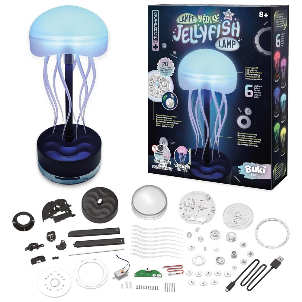 A BUKI medúza lámpa építő készletével a gyerekek saját, világító dekorációt készíthetnek. Az alkatrészek és fogaskerekek összeállításával egy különleges, mozgó medúza lámpa hozható létre, amely egyszerre játék és hangulatvilágítás.