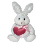 Szerelmes szürkésfehér ülő plüss nyuszi rózsaszín masnival és mályva színű szívecskével (25 cm). Leültetve a feje tetejéig mérve 25 cm magas, a füle hegyéig mérve kb. 35 cm magas. Szeme műanyag, orra hímezve van.