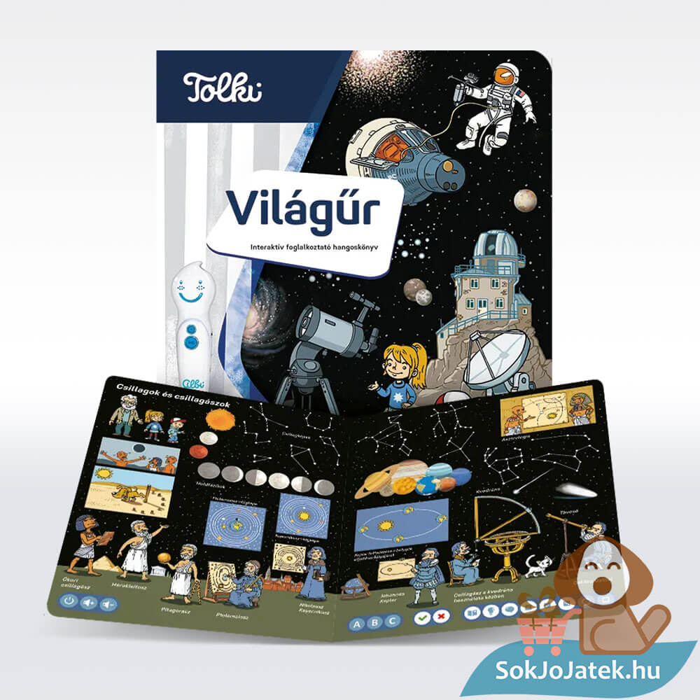 A több mint 2600 rögzített hanganyag és kvízkérdés segítségével a gyerekek saját tempójukban fedezhetik fel a világűr izgalmait. A Tolki könyv szövegét Pulzár professzor, Albina, Jónás, Einstein kutya és Erisz cica kalauzolásával élhetik át, így a tanulás valódi kalanddá válik.