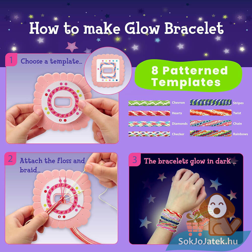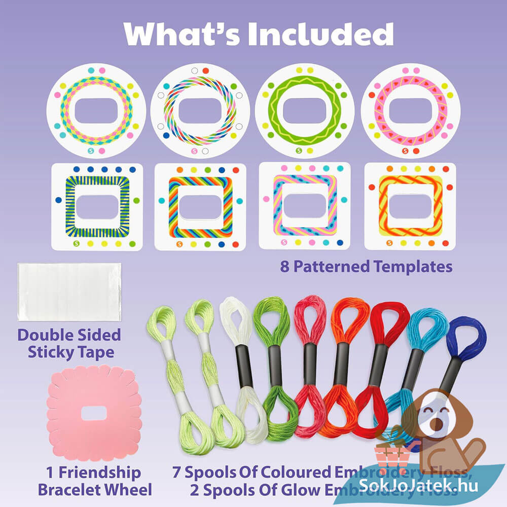 A kreatív játék csomag tartalmaz minden szükséges elemet: szövőkorongokat, élénk színű világító fonalakat, valamint részletes útmutatót, 8 féle sablonnal. A szövési technikát könnyen el lehet sajátítani, így a sikerélmény is garantált lesz.