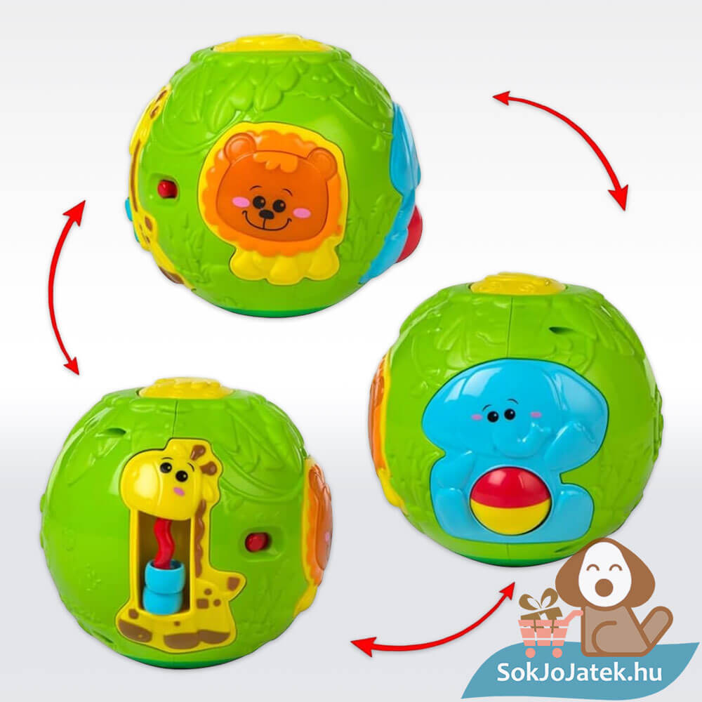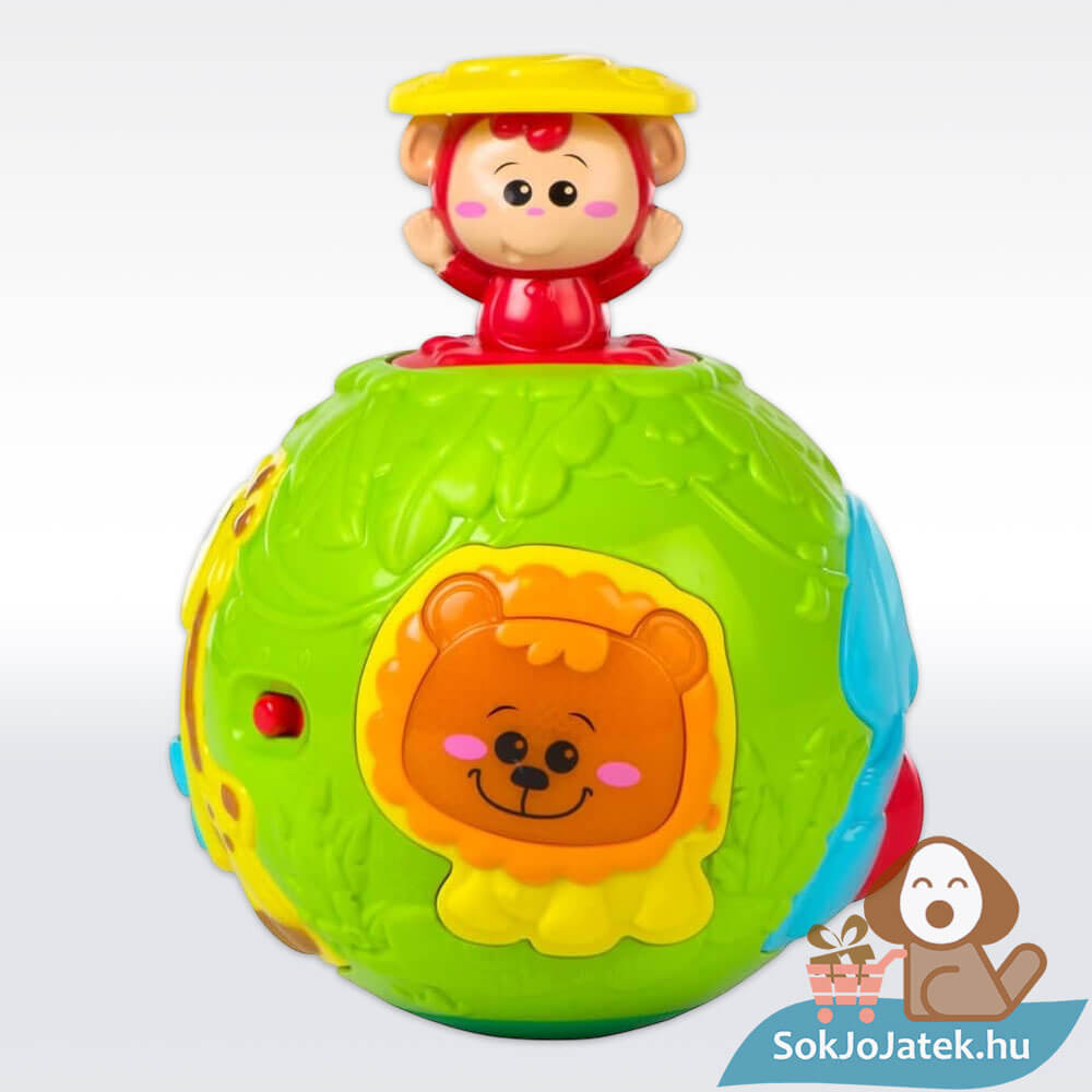A labda oldalán kedves dzsungelállatok (elefánt, zsiráf, oroszlán) kaptak helyet. Az elefánt pocakja egy beépített csörgő golyót rejt, a zsiráf nyaka karikákkal van ellátva, amelyeket a baba mozgathat, míg az oroszlán orrának megnyomására fények, zenék és hangok kelnek életre. A labda tetején megbújó piros kismajom pedig meglepetésszerűen előugrik, amikor aktiválódik a játék!